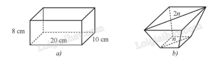Một chiếc khay đựng đầy nước có dạng hình hộp chữ nhật với kích thước: chiều dài 20 cm, chiều rộng 10 cm, chiều cao 8 cm (hình vẽ a). Để san bớt nước cho đỡ đầy, người ta đổ nước từ chiếc khay thứ nhất đó sang chiếc khay thứ hai có dạng hình chóp cụt tứ giác đều với đáy khay là hình vuông nhỏ có đường chéo dài \(n\) (cm), miệng khay là hình vuông lớn có đường chéo dài \(2n\) (cm) (hình vẽ b). Sau khi đổ, mực nước ở khay thứ hai cao bằng \(\frac{2}{3}\) chiều cao của khay đó và lượng nước trong khay thứ nhất giảm đi \(\frac{1}{4}\) so với ban đầu. Tính thể tích của chiếc khay thứ hai theo đơn vị centimét khối.