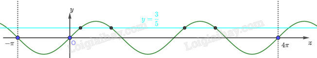 Vẽ đồ thị hàm số \(y = \sin x\), đường thẳng \(y = \frac{3}{5}\) và đếm số giao điểm có hoành độ thuộc đoạn \(\left[ { – \pi ;4\pi } \right]\)