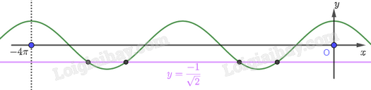 Vẽ đồ thị hàm số \(y = \cos x\), đường thẳng \(y = \frac{{ – 1}}{{\sqrt 2 }}\) và đếm số giao điểm có hoành độ thuộc khoảng \(\left( { – 4\pi ;0} \right)\)