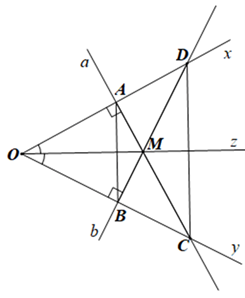 Cho góc xOy khác góc bẹt. Oz là tia phân giác của góc đó, M là một điểm bất kì thuộc tia Oz. Qua M vẽ đường thẳng a vuông góc với Ox tại A, cắt Oy tại C. Qua M vẽ đường thẳng b vuông góc với Oy tại B, cắt Ox tại D. Chứng minh: