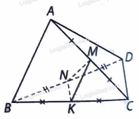 Lấy \(K\) là trung điểm của cạnh \(BC\), ta có: \(NK\) và \(MK\) lần lượt là đường trung bình của tam giác \(BCD\) và tam giác \(ABC\) nên \(NK = a,MK = a\sqrt 2 \).