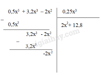 Thực hiện phép chia 0,5x^5 + 3,2x^3 – 2x^2 cho 0,25x^n trong mỗi trường hợp sau: a) n = 2 b) n = 3