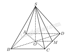 Gọi \(O\) là giao điểm của \(AC\) và \(BD\), ta có \(SO\) vuông góc với mặt đáy \(\left( {ABCD} \right)\). Kẻ \(OM\) vuông góc với \(CD\) tại \(M\) thì \(SM\) cũng vuông góc với \(CD\) nên góc giữa hai mặt phẳng \(\left( {SCD} \right)\) và \(\left( {ABCD} \right)\) bằng góc giữa hai đường thẳng \(SM\) và \(OM\), mà \(\left( {SM,OM} \right) = \widehat {SMO} = 60^\circ \).