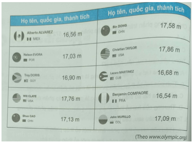 Tại thế vận hội Mùa hè năm 2016, kết quả chung kết môn nhảy ba bước nam của 10 vận động viên có thành tích tốt nhất được cho trong bảng sau: a) Sắp xếp theo thứ tự từ cao xuống thấp kết quả thi đấu của 10 vận động viên này b) Em hãy cho biết huy chương vàng, bạc, đồng thuộc về các vận động viên nào?