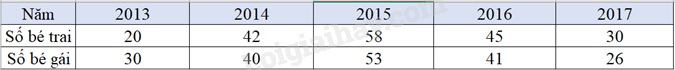 Trong suốt \(5\) năm, trường mẫu giáo M thống kê số bé nhập học lớp “mầm” (dành cho trẻ \(3\) tuổi). Số liệu thu được là: Năm \(2013\) có \(20\) bé trai, \(30\) bé gái; năm \(2014\) có \(42\) bé trai, \(40\) bé gái; năm \(2015\) có \(58\) bé trai, \(53\) bé gái; năm \(2016\) có \(45\) bé trai, \(41\) bé gái; năm \(2017\) có \(30\) bé trau, \(26\) bé gái.