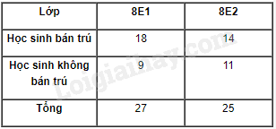 Hai lớp 8E1 và 8E2 của một trường trung học cơ sở có \(32\) học sinh bán trú, trong đó \(14\) học sinh thuộc lớp 8E2. Số học sinh không bán trú của hai lớp này lần lượt là \(9\) và \(11.\)