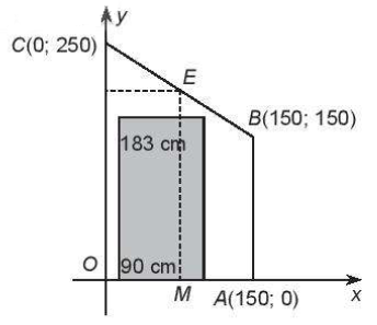 + Để tận dung tối đa chiều cao thể khi kê tủ lạnh thì bố mẹ Nam sẽ kê tủ sát vào trục Oy, Do đó để kê được một chiếc tủ lạnh 2 cánh với bề ngang 90 cm thì chiều cao của tủ phải nhỏ hơn tung độ của điểm E thuộc đường thẳng BC với hoành độ điểm E bằng 90