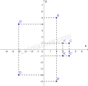 Trên mặt phẳng tọa độ Oxy, cho tọa độ của các điểm \(A\left( {3; – 1} \right),B\left( {2;5} \right),C\left( {4;1} \right)\) và \(D\left( { – 4; – 4} \right)\). Tìm tọa độ của các điểm A’, B’, C’ và D’ sao cho trục hoành là đường trung trực của AA’, BB’, CC’, DD’.