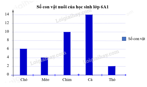 Vẽ biểu đồ cột biểu diễn dữ liệu từ bảng thống kê sau: Các con vật nuôi của học sinh lớp 6A1 Loài vật được nuôi Số con Chó 6 Mèo 4 Chim 10 Cá 14 Thỏ 2