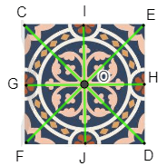 b) Viên gạch có 4 trục đối xứng là các đường thẳng IJ, GH, EF, CD.