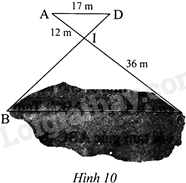 b) Vì  nên \(\frac{{IA}}{{IC}} = \frac{{AD}}{{BC}}\) hay \(\frac{{12}}{{36}} = \frac{{17}}{{BC}}\). Vậy \(BC = \frac{{17.36}}{{12}} = 51\left( m \right)\)