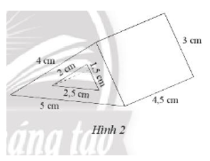 Một khối kim loại có dạng hình lăng trụ đứng đáy tam giác vuông có kích thước hai cạnh góc vuông là 3 cm, 4 cm, cạnh huyền 5 cm. Người ta khoét một lỗ hình lăng trụ đứng đáy tam giác vuông hai cạnh góc vuông có kích thước là 2 cm, 1,5 cm, cạnh huyền 2,5 cm (Hình 2). Tính thể tích của khối kim loại (không tính cái lỗ).