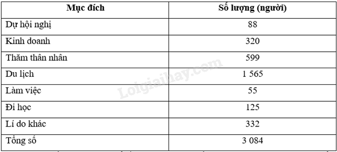 Trong tháng vừa qua có 3 084 người nhập cảnh ngắn hạn vào nước X. Cơ quan hải quan thống kê mục đích nhập cảnh của họ và cho kết quả trong bảng sau: