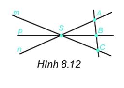 Xem hình 8.12 và trả lời: a. Có bao nhiêu bộ ba điểm thẳng hàng? b. Hãy nêu ít nhất hai bộ ba điểm không thẳng hàng. c. Bốn điểm A,B,C và S có thẳng hàng không?