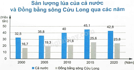 Cho bảng thống kê sản lượng lúa (triệu tấn) của cả nước và Đồng bằng song Cửu Long qua các năm.
