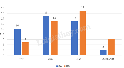 Biểu đồ đoạn thẳng ở Hình 22 biểu diễn số lượng học sinh đạt kết quả học tập Học kì I mức Tốt, Khá, Đạt, Chưa đạt của mỗi lớp 8A, 8B.