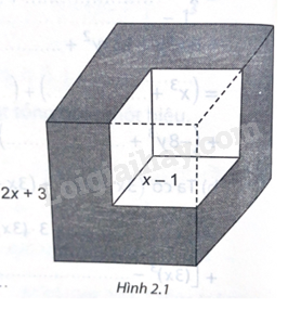 Từ một khối lập phương có độ dài cạnh là \(2x + 3\) (cm), ta cắt bỏ một khối lập phương có độ dài \(x-1\) (cm) (H.2.1). Tính thể tích phần còn lại, viết kết quả dưới dạng đa thức.