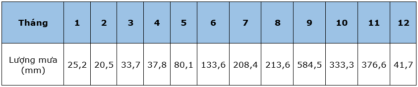 – Các tháng có lượng mưa nhiều (trên 100 mm): từ tháng 6 đến tháng 11.