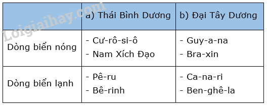 Dựa vào hình 3 SGK (trang 166), em hãy kể tên hai dòng biển nóng và hai dòng biển lạnh ở: a) Thái Bình Dương b) Đại Tây Dương