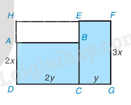 \(\begin{array}{l}{S_{HFGD}} = 3x(2y + y) = 3x.3y = 9xy\\{S_{HEBA}} = (3x – 2x).2y = x.2y = 2xy\end{array}\)