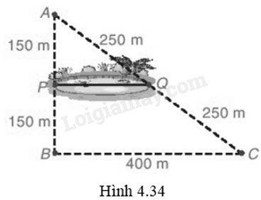 Bác Mến muốn tính khoảng cách giữa hai vị trí P, Q ở hai bên bờ ao cá. Để làm điều đó, bác Mến chọn ba vị trí A, B, C, thực hiện đo đạc và vẽ mô phỏng như Hình 4.34. Em hãy giúp bác Mến tính khoảng cách giữa hai điểm P và Q.
