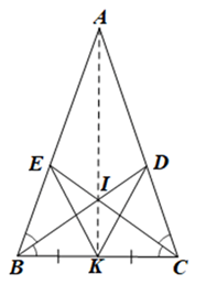 Cho tam giác ABC cân tại A có K là trung điểm của đoạn BC. Hai đường phân giác BD và CE cắt nhau tại I. Chứng minh:
