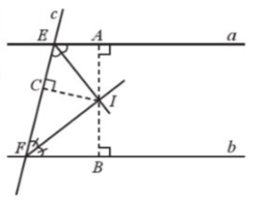 Cho hai đường thẳng song song a, b và một đường thẳng c (c cắt a tại E, c cắt b tại F). Hai tia phân giác của các góc aEF và bFE cắt nhau tại I. Gọi A, B lần lượt là hình chiếu của I trên các đường thẳng a và b (Hình 52).