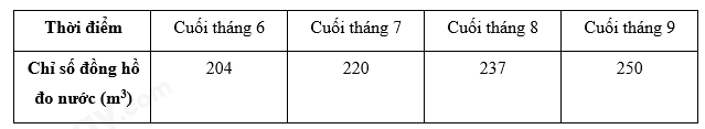 Chỉ số đo đồng hồ nước sinh hoạt của nhà bạn Hạnh được thống kê theo bảng sau: