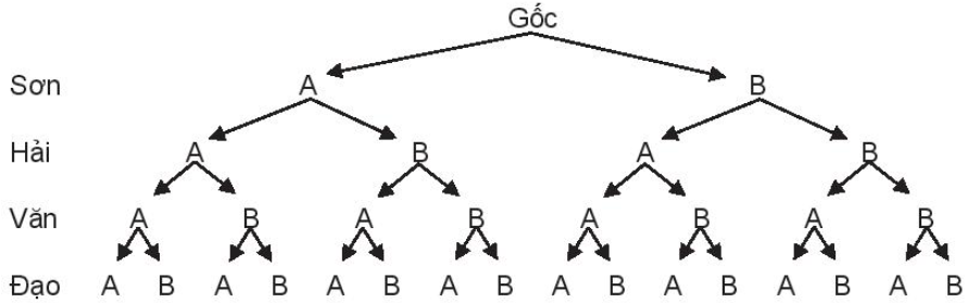Trên một phố có hai quán ăn A, B. Bốn bạn Sơn, Hải, Văn, Đạo mỗi người chọn ngẫu nhiên một quán ăn.