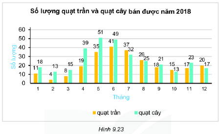 Biểu đồ hình 9.23 cho biết số lượng quạt trần và quạt cây bán được tại một cửa hàng điện máy trong năm 2018