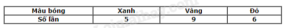 b. Em hãy lấy một quả bóng từ túi đó 20 lần, sau mỗi lần ghi lại xem quả bóng lấy được có màu gì rồi trả bóng lại túi trước khi lấy lần sau. Hoàn thiện bảng thống kê sau: