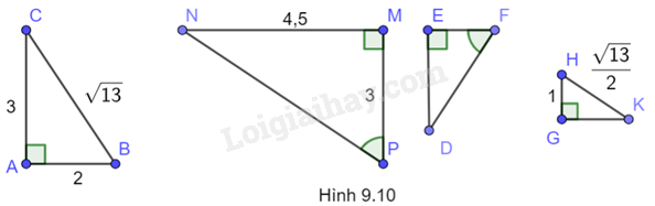 Tam giác ABC và tam giác GHK có: \(\widehat A = \widehat G = {90^0},\frac{{AB}}{{GH}} = \frac{{BC}}{{HK}}\left( {do\;\frac{2}{1} = \frac{{\sqrt {13} }}{{\frac{{\sqrt {13} }}{2}}}} \right)\)