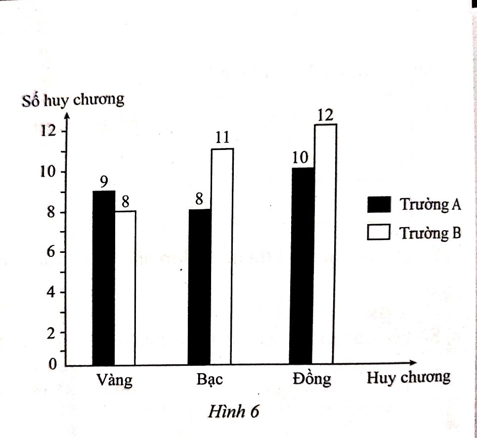 Hai trường A và B đã tổ chức ngày hội thể thao nhân kỉ niệm ngày thành lập Đoàn Thanh niên Cộng sản Hồ Chí Minh. Biểu đồ cột kép ở hình 6 biểu diễn số huy chương Vàng, Bạc và Đồng của hai trường A và B.