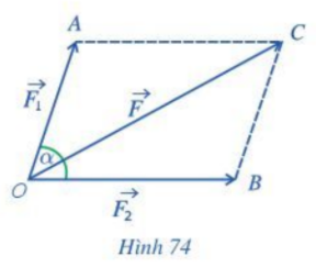 Hai lực \(\overrightarrow {{F_1}} ,\overrightarrow {{F_2}} \) cho trước cùng tác dụng lên một vật tại điểm O và tạo với nhau một góc \((\overrightarrow {{F_1}} ,\overrightarrow {{F_2}} ) = \alpha \) làm cho vật di chuyển theo hướng từ O đến C (Hình 74). Lập công thức tính cường độ của hợp lực \(\overrightarrow F \) làm cho vật di chuyển theo hướng từ O đến C (giả sử chỉ có đúng hai lực \(\overrightarrow {{F_1}} ,\overrightarrow {{F_2}} \) làm cho vật di chuyển).