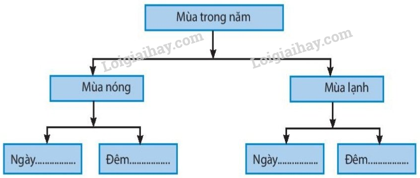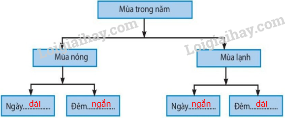 Em hãy điền từ “ngắn” hoặc “dài” vào bên cạnh từ “Ngày”, “Đêm” trong sơ đồ sau sao cho phù hợp với hiện tượng ngày, đêm dài, ngắn theo mùa.