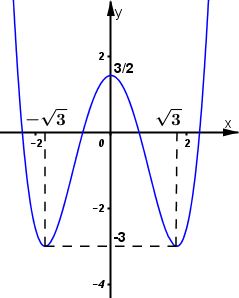 Hàm số đạt cực tiểu tại hai điểm \(\displaystyle x=-\sqrt3\) và \(\displaystyle x=\sqrt3\); \(\displaystyle y_{CT}=y\,(\pm\sqrt3)=-3\)
