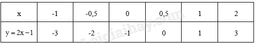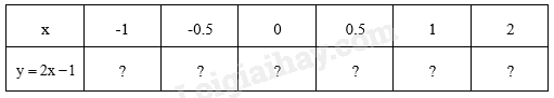 –         Để tìm giá trị thích hợp điền vào bảng, để tìm y trong 1 cột thì ta cần thay x đã cho ở cột đấy vào \(y = 2x – 1\) để tính giá trị của y tương ứng