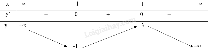 Ta có: \(y’ = – 3{x^2} + 3,y’ = 0 \Leftrightarrow x = \pm 1\)