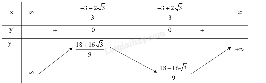 Trên khoảng \(\left( {\frac{{ – 3 – 2\sqrt 3 }}{3};\frac{{ – 3 + 2\sqrt 3 }}{3}} \right)\), \(y’ < 0\) nên hàm số nghịch biến. Trên khoảng \(\left( { – \infty ;\frac{{ – 3 – 2\sqrt 3 }}{3}} \right)\) và \(\left( {\frac{{ – 3 + 2\sqrt 3 }}{3}; + \infty } \right)\), \(y’ > 0\) nên hàm số đồng biến trên mỗi khoảng đó.