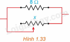 Trong Vật lí, ta biết rằng khi mắc song song hai điện trở \({R_1}\) và \({R_2}\) thì điện trở tương đương R của mạch điện được tính theo công thức \(R = \frac{{{R_1}{R_2}}}{{{R_1} + {R_2}}}\) (theo Vật lí đại cương, NXB Giáo dục Việt Nam, 2016). Giả sử một điện trở \(8\Omega \) được mắc song song với một biến trở như Hình 1.33. Nếu điện trở đó được kí hiệu là \(x\left( \Omega \right)\) thì điện trở tương đương R là hàm số của x. Vẽ đồ thị của hàm số \(y = R\left( x \right),x > 0\) và dựa vào đ