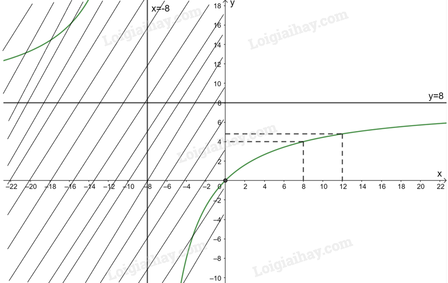Do đó, đồ thị hàm số \(y = R\left( x \right) = \frac{{8x}}{{x + 8}}\) với \(x > 0\) nhận đường thẳng \(y = 8\) làm tiệm cận ngang (phần bên phải trục Oy).