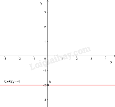 Ta có \(0x + 2y =  – 4 \Rightarrow y =  – 2\) nên mỗi cặp số \(\left( {x; – 2} \right)\) với \(x \in \mathbb{R}\) tùy ý là một nghiệm của phương trình \(0x + 2y =  – 4\)