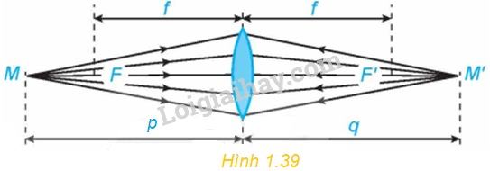 Xét một thấu kính hội tụ có tiêu cự f (H.1.39). Khoảng cách p từ vật đến thấu kính liên hệ với khoảng cách q từ ảnh đến thấu kính bởi hệ thức: \(\frac{1}{p} + \frac{1}{q} = \frac{1}{f}\).