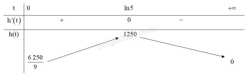 Đặt \(h\left( t \right) = \frac{{25\;000{e^{ – t}}}}{{{{\left( {1 + 5{e^{ – t}}} \right)}^2}}}\).