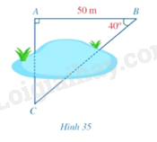 Hình 35 mô tả ba vị trí \(A,B,C\) là ba đỉnh của một tam giác vuông và không đo được trực tiếp các khoảng cách từ \(C\) đến \(A\) và từ \(C\) đến \(B\). Biết \(AB = 50m\), \(\widehat {ABC} = 40^\circ \). Tính khoảng cách \(CA\) và \(CB\) (làm tròn kết quả đến hàng đơn vị của mét).