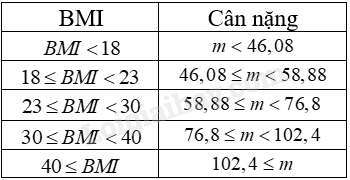 Chỉ số khối cơ thể, thường được biết đến với tên viết tắt BMI (tiếng Anh là Body Mass Index) cho phép đánh giá thể trạng của một người là gầy, bình thường hay béo. Chỉ số khối cơ thể của một người được tính theo công thức sau: \(BMI = \frac{m}{{h{}^2}}\), trong đó m là khố lượng cơ thể tính theo kilôgam, h là chiều cao tính theo mét. Dưới đây là bảng đánh giá thể trạng ở người lớn theo BMI đối với khu vực châu Á – Thái Bình Dương: a. Giả sử một người đàn ông có chiều cao 1,68m. Hãy lập bản