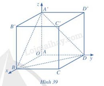Xét hệ tọa độ Oxyz gắn với hình lập phương ABCD.A’B’C’D’ như Hình 39, đơn vị của mỗi trục bằng độ dài cạnh hình lập phương. Biết A(0;0;0), B(1;0;0), D(0;1;0), A’(0;0;1).