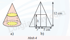 Cho một hình trụ nội tiếp trong hình nón có chiều cao bằng 12 cm và bán kính đáy bằng 5 cm (Hình 4a). Người ta cắt hình nón, trụ này theo mặt phẳng chứa đường thẳng nối đỉnh và tâm hình tròn đáy của hình nón thì thu được một hình phẳng như Hình 4b