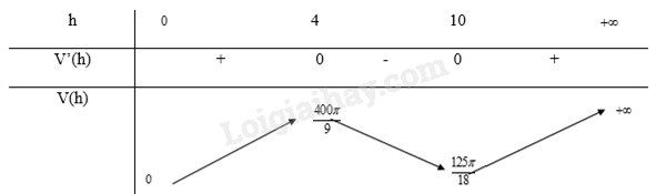 Từ bảng biến thiên, ta thấy \(\mathop {\max }\limits_{(0; + \infty )} V(h) = V(4) = \frac{{400\pi }}{9}\)