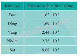 c) Tính điện trở suất \(\rho \) của dây điện. Từ đó, hãy cho biết dây điện được làm bằng kim loại nào trong số các kim loại được cho ở bảng sau: